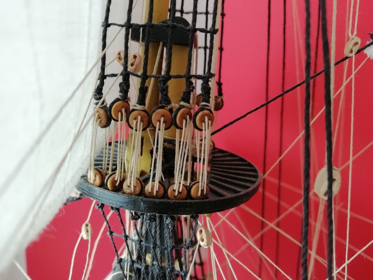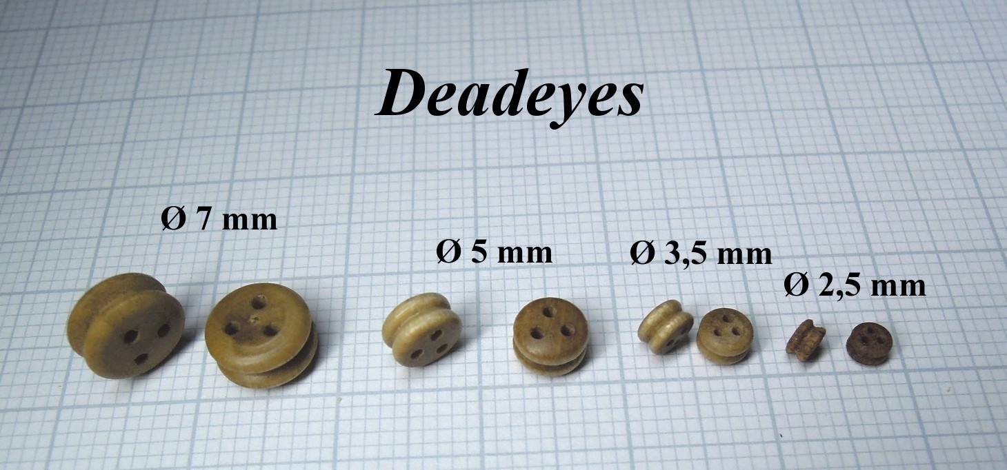 Jeu de blocs de bois CNC avec deadeyes ronds basés sur des sources historiques, remplaçant les blocs de tension triangulaires dans le kit d'origine. Total : 218 blocs de bois + 120 pinces. Le Soleil Royal 1:100.