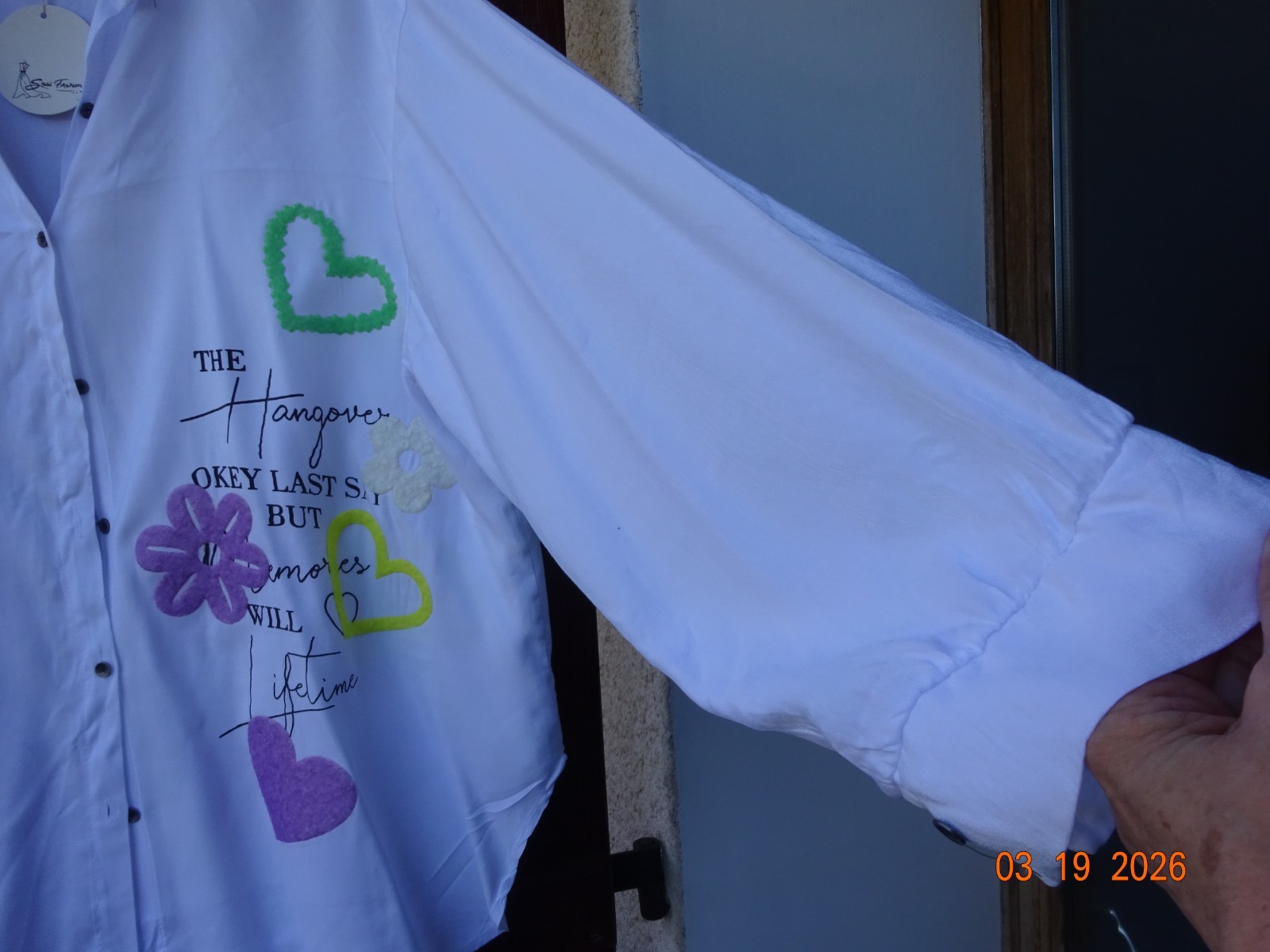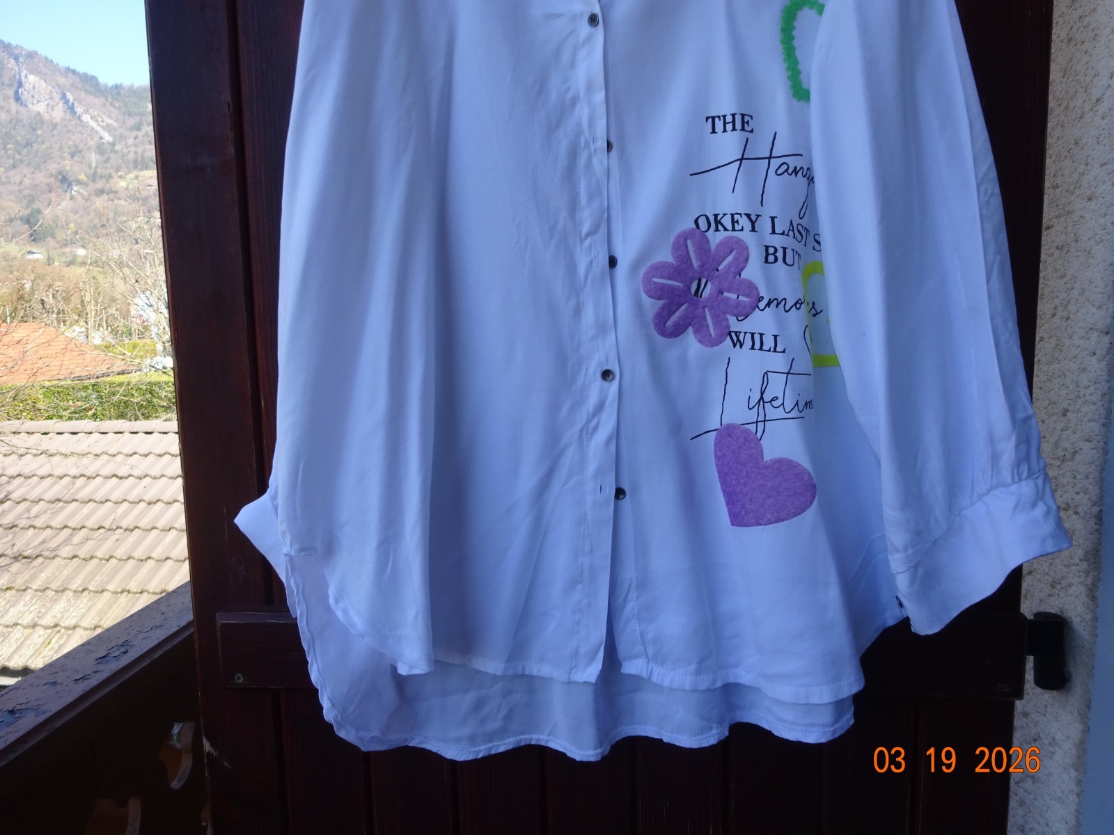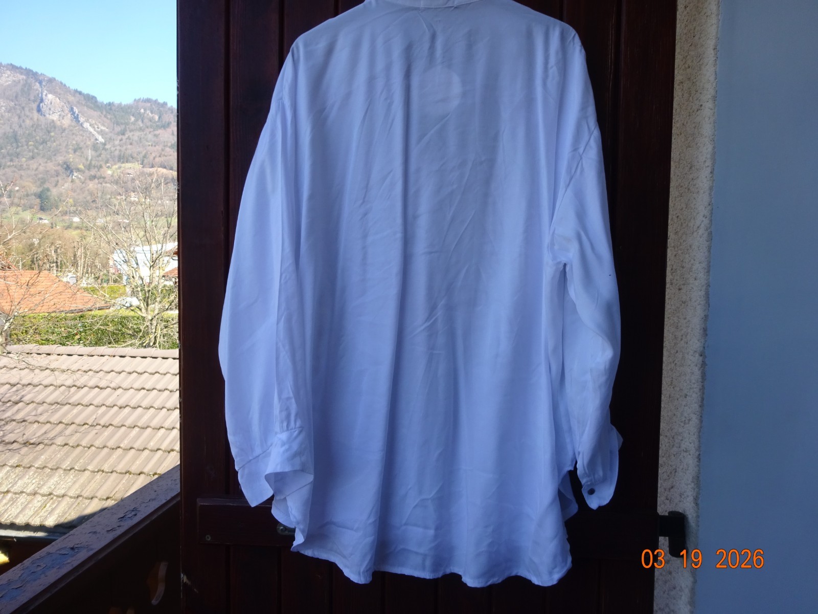 Assez longue. col boutonné au devant. manches longues. BLANC avec belle broderie sur un coté du devant.